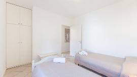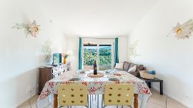 (75/85 m²) Wohnzimmer mit Kochnische und Doppelschlafcouch, Doppelzimmer, 2 Zimmern mit Zwei Einzelbetten oder Etagenbetten, zwei Badezimmer mit Dusche.