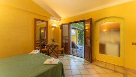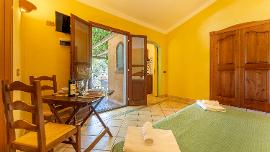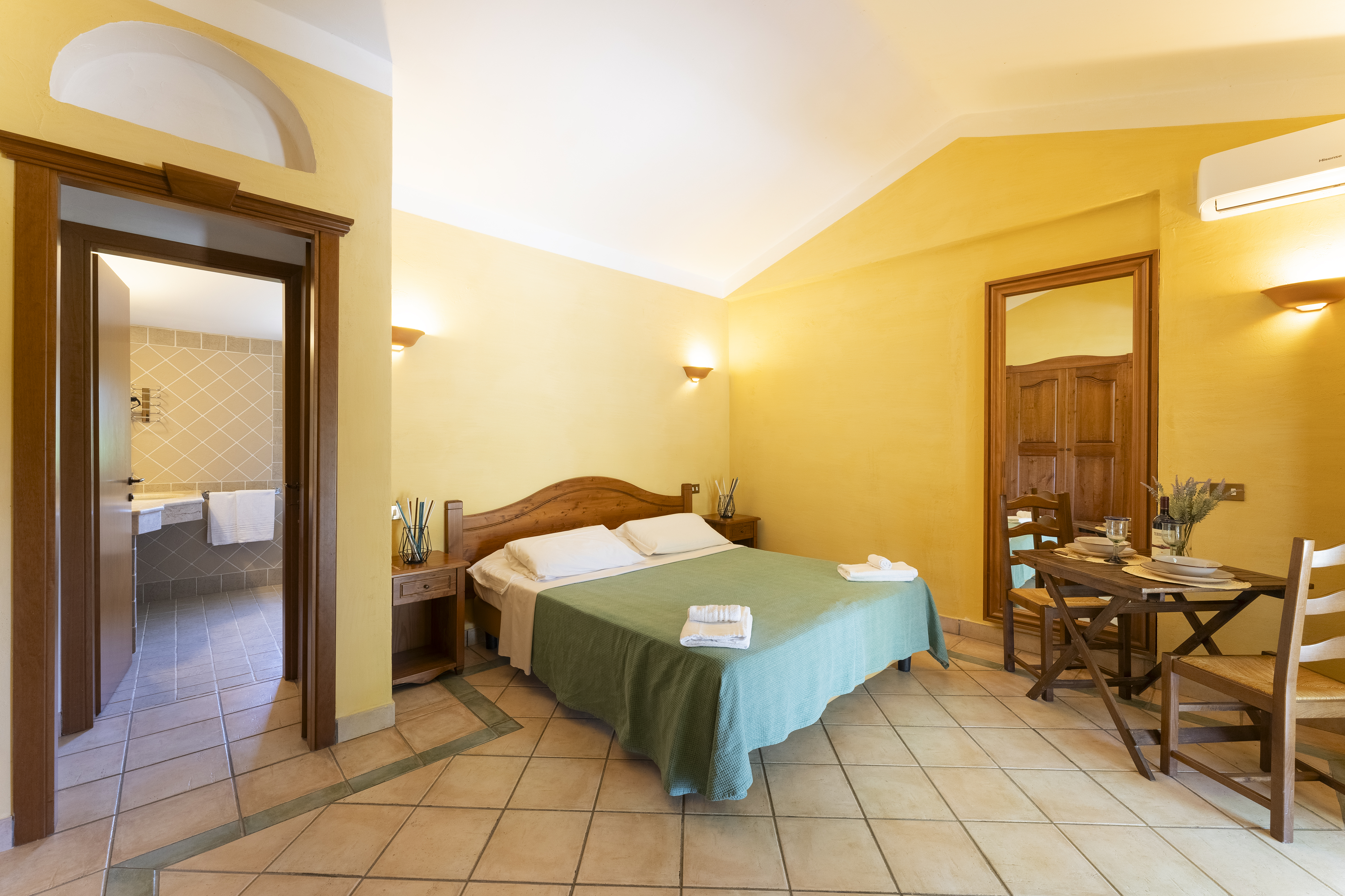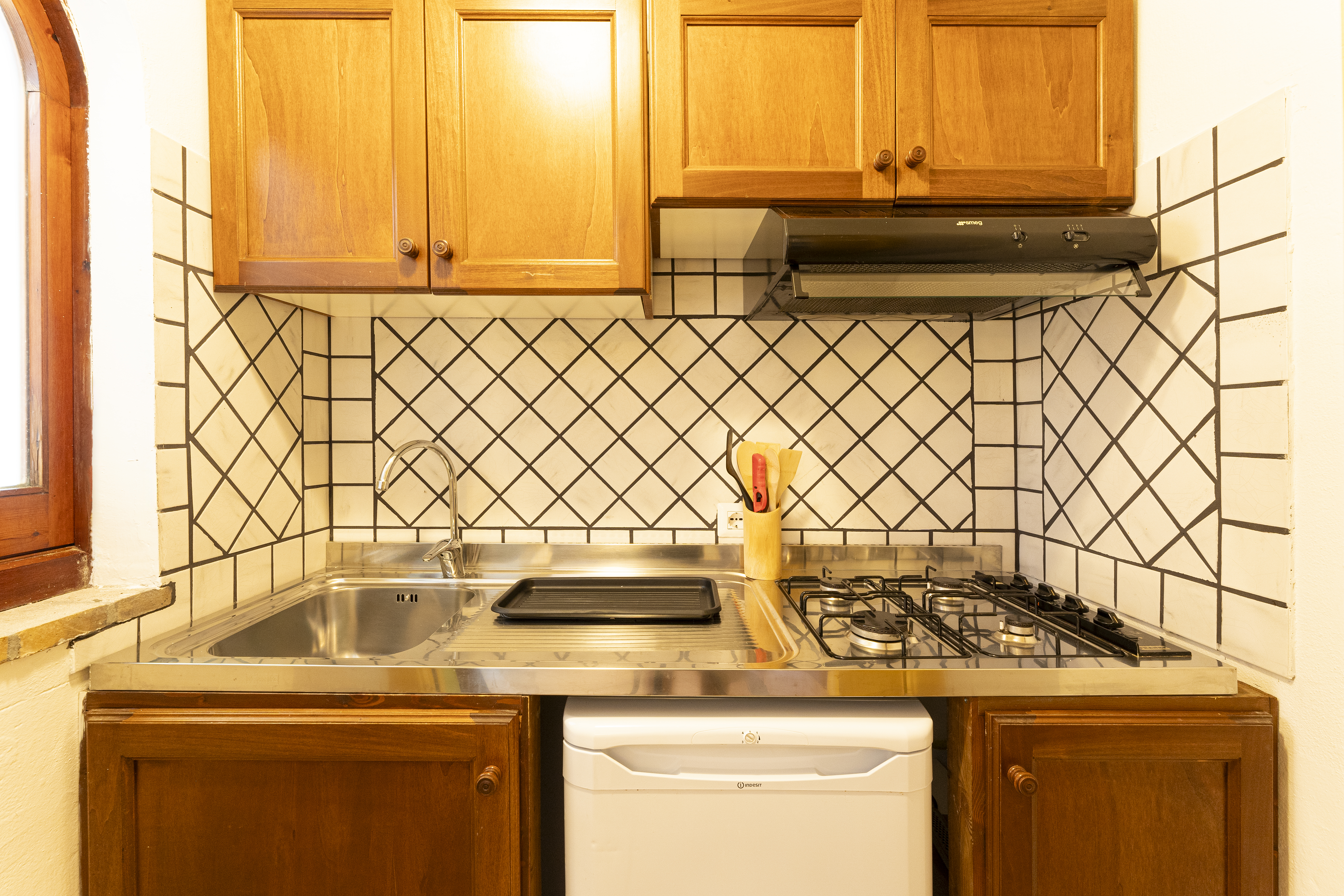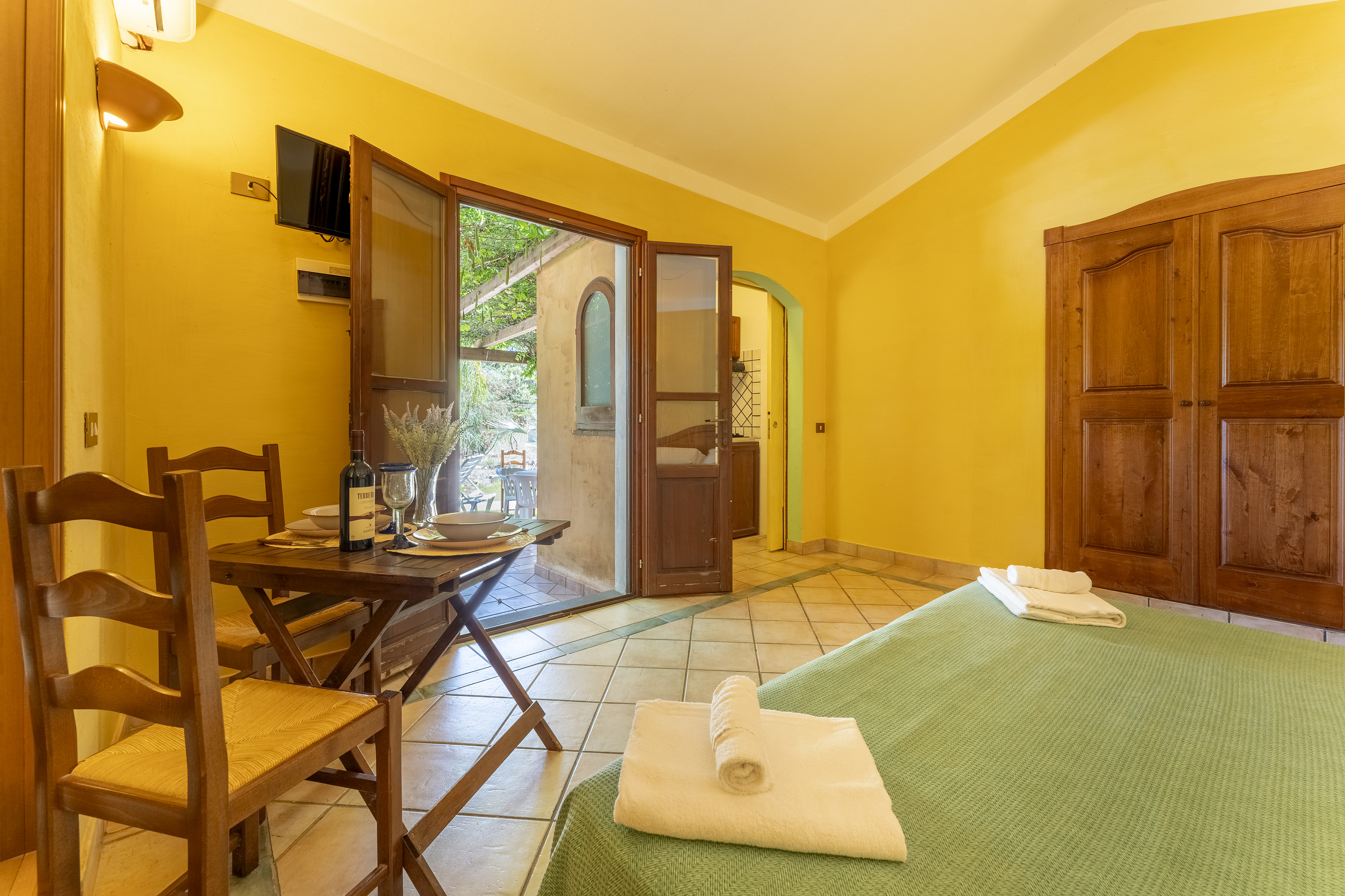 (20/25 m²): salón con cocina americana, nevera de mesa, cama doble o matrimonial, cuarto de baño con ducha. Todos los estudios están situados en la planta baja.