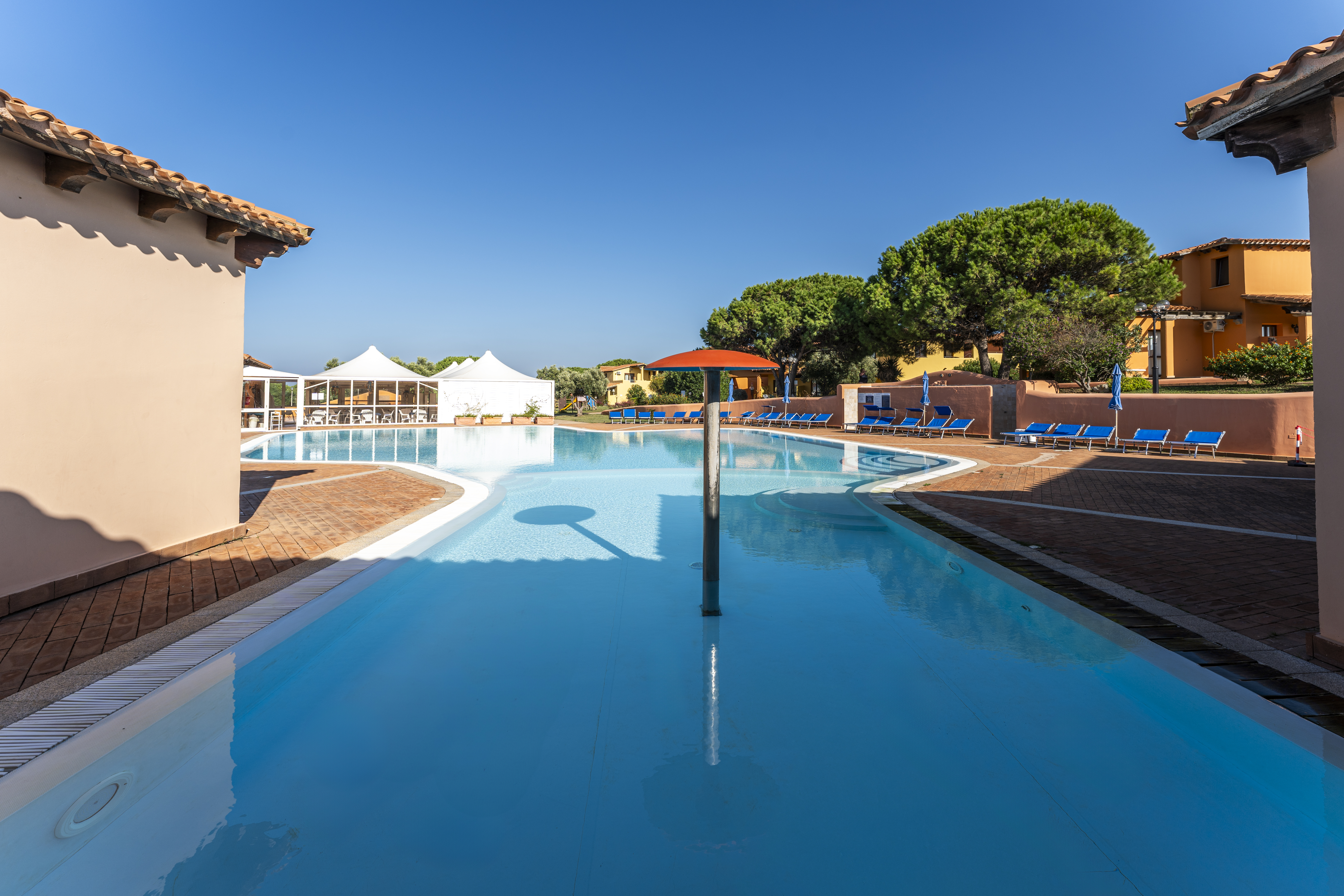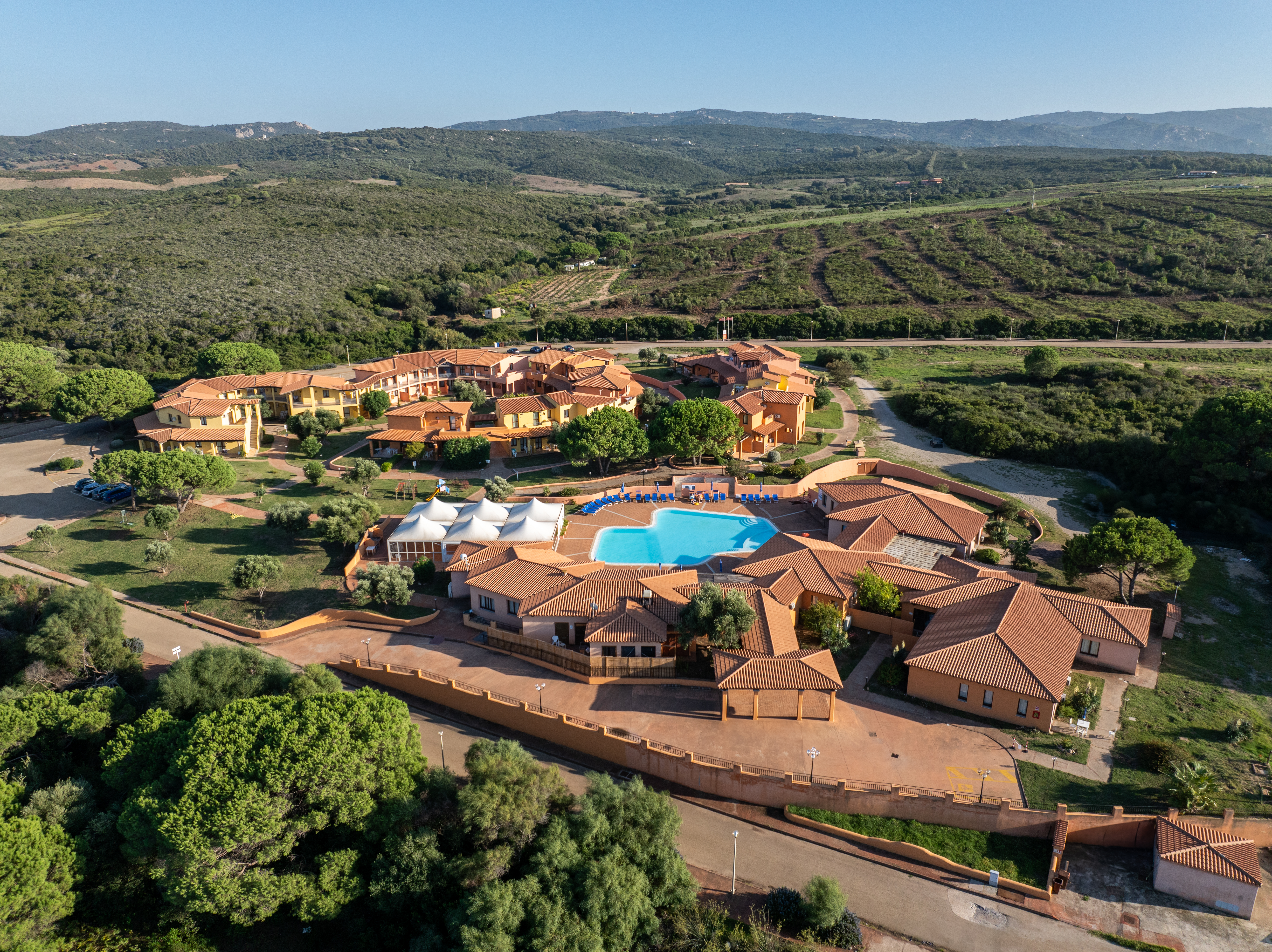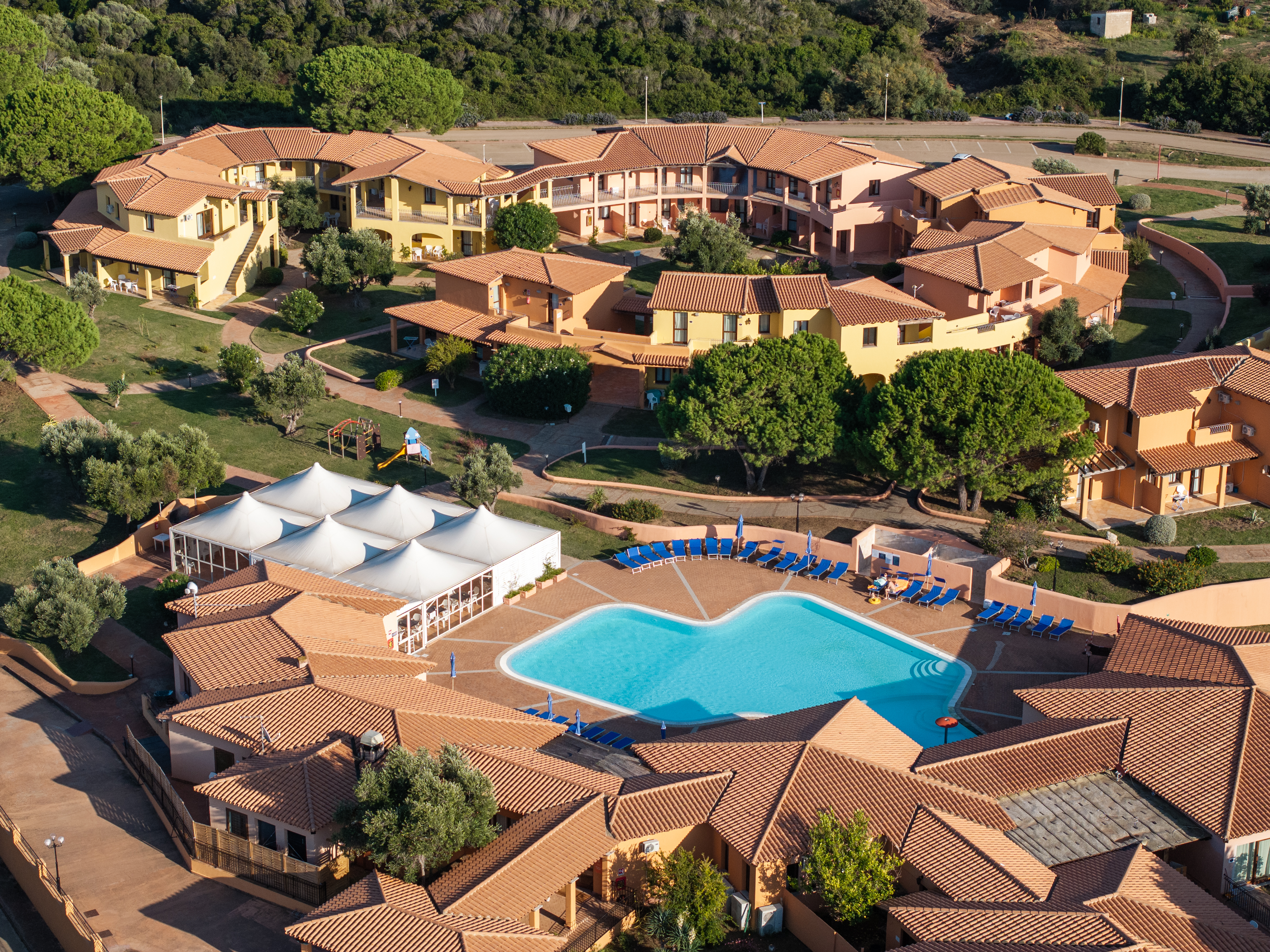 Enmarcada por un hermoso pinar, la residencia, diseñada siguiendo el estilo arquitectónico de la región de Gallura, es ideal para alojarse en familia, con amigos o en pareja.