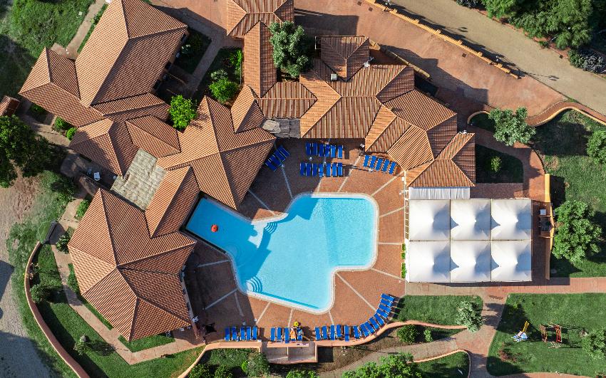 Su distribución recuerda a la de un patio: en la parte central se encuentra la oficina de recepción, siempre dispuesta a darle la bienvenida, un snack bar, un pequeño mercado, una lavandería con lavadoras y secadoras y, por último, una espléndida piscina con una zona para los más pequeños.